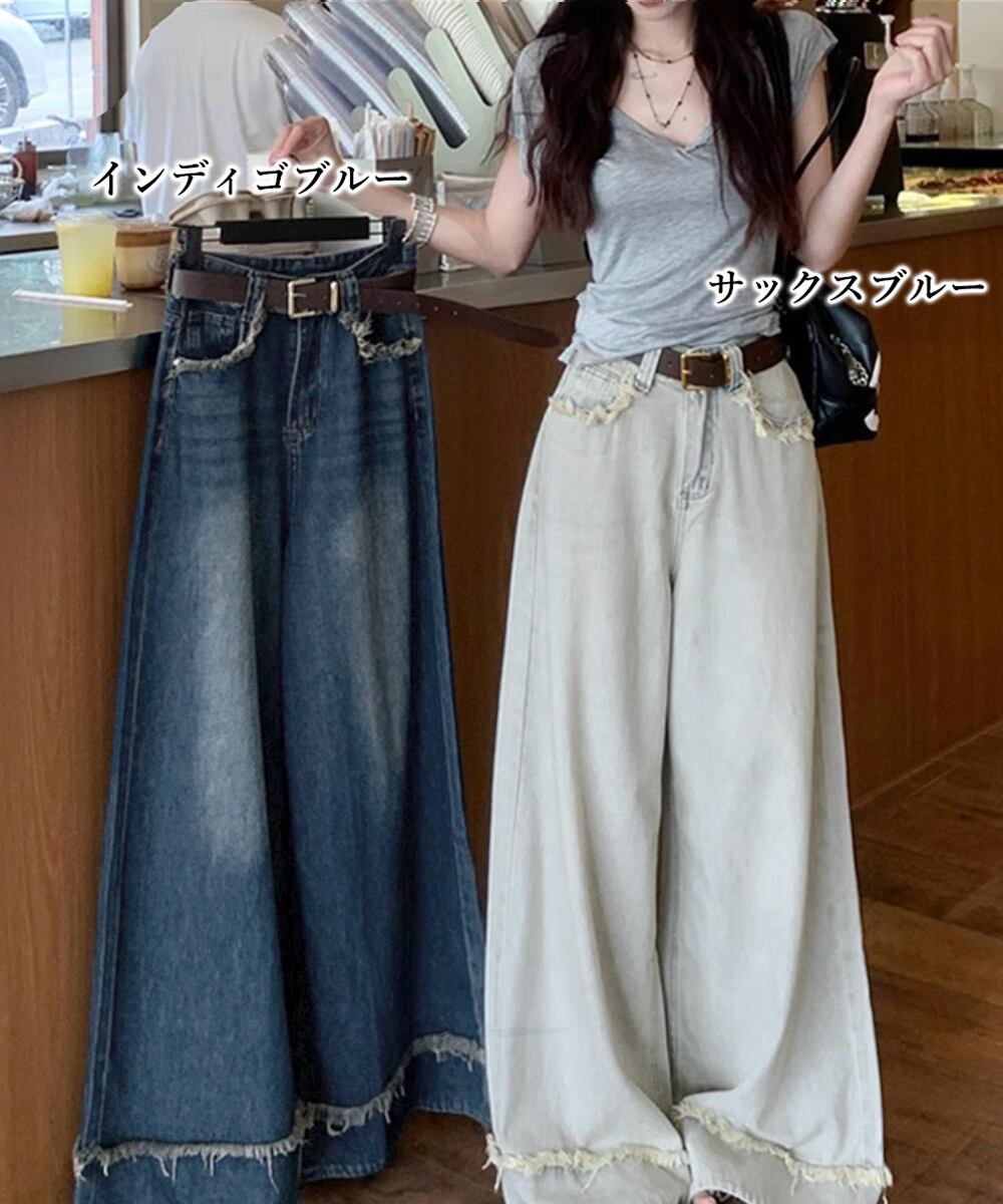 ハイウエスト デニムワイドパンツ 韓国風