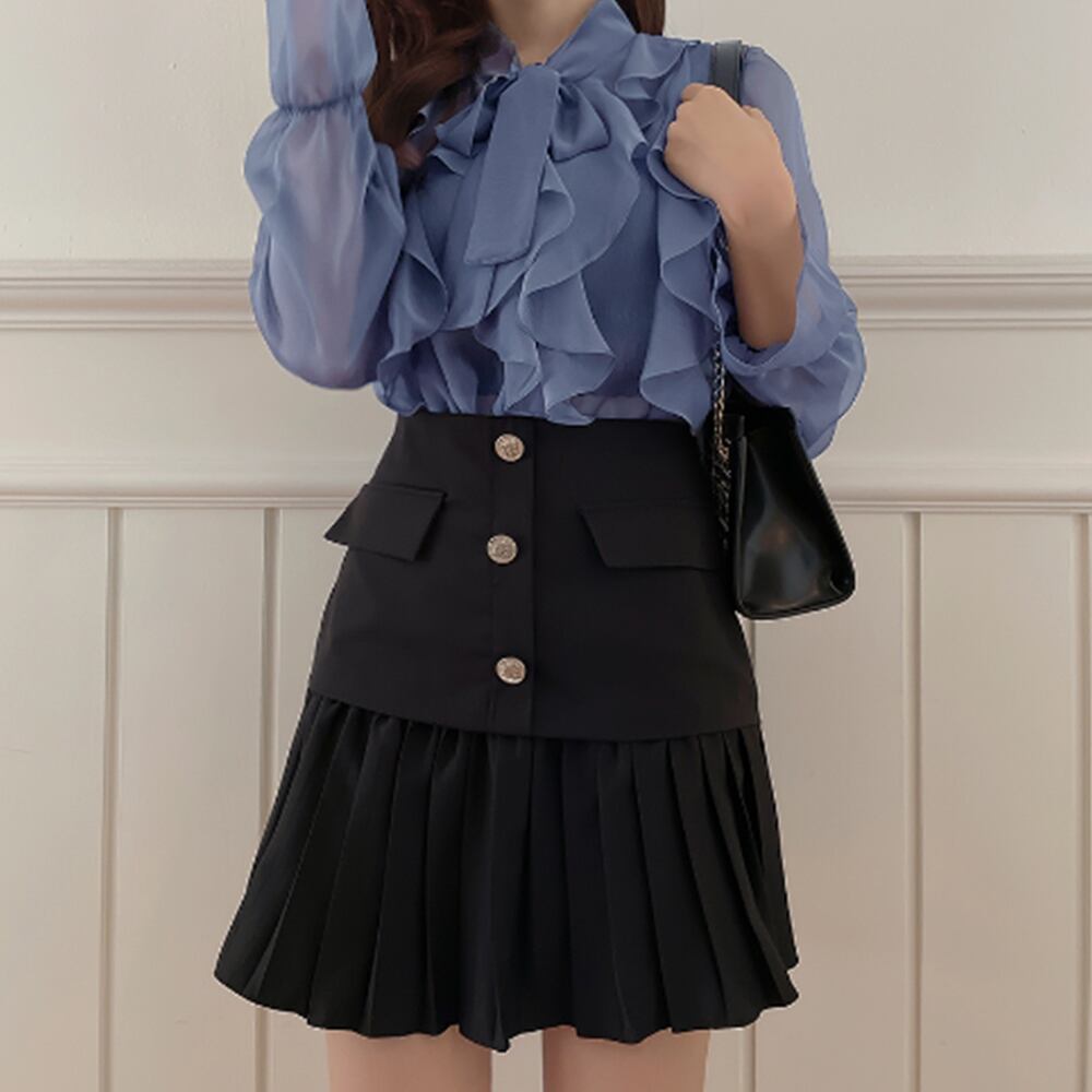 夏らしい清涼感と軽やかさを出しつつ、大人の女性らしい上品な雰囲気に仕上げてくれるフリルシアーブラウス