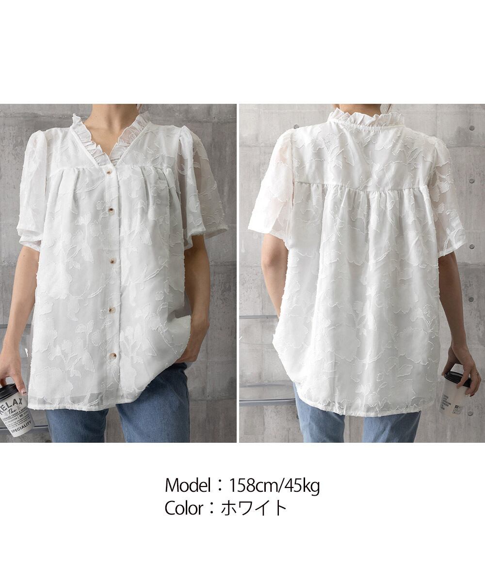 Vネックフリルブラウス 花柄刺しゅう夏服