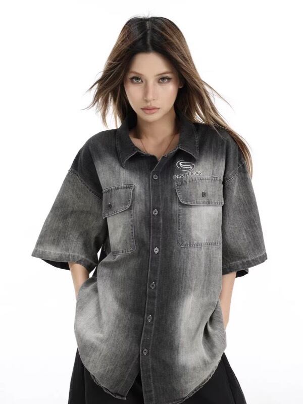 トップス カジュアルシャツ デニムシャツ 半袖 ウォッシュ加工 ユニセックス
