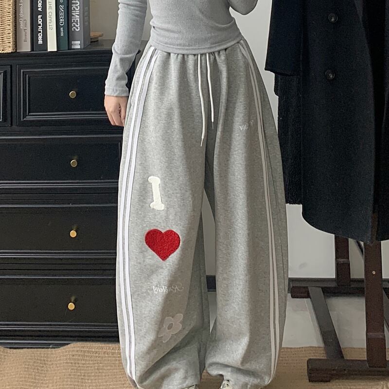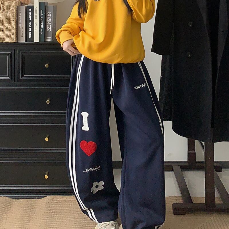 レディース ワイドパンツ スウェットパンツ ストライプ × ハート刺繍 ゆったり カジュアル