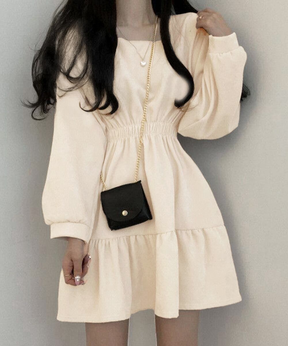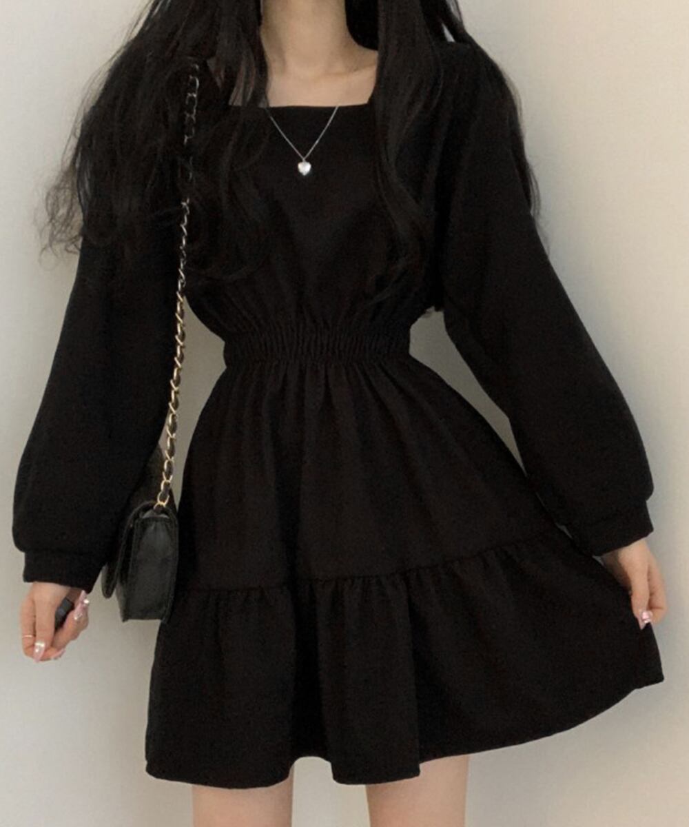 スクエアネック長袖 韓国風ワンピース黒 ガーリーワンピース