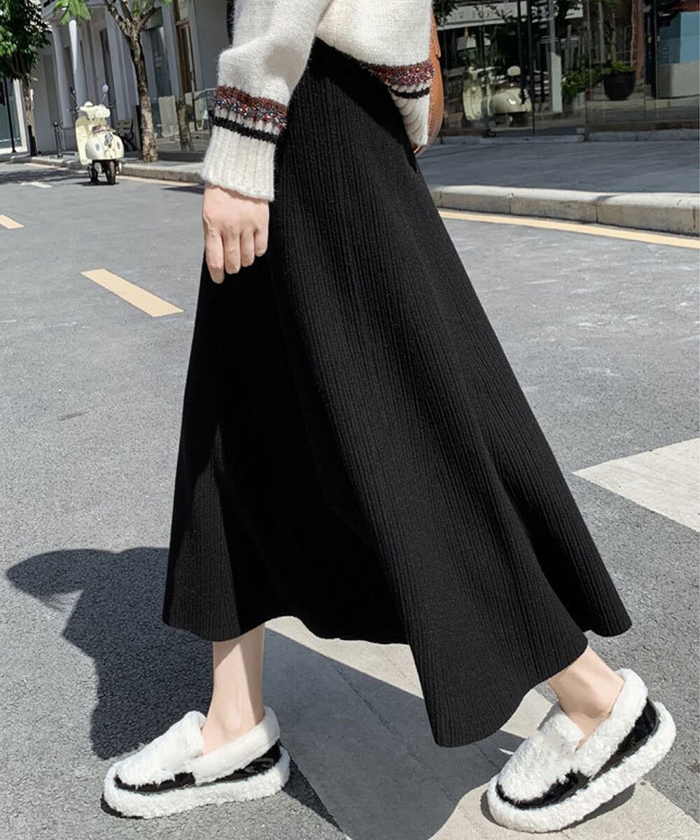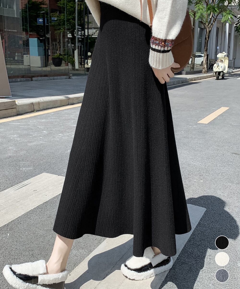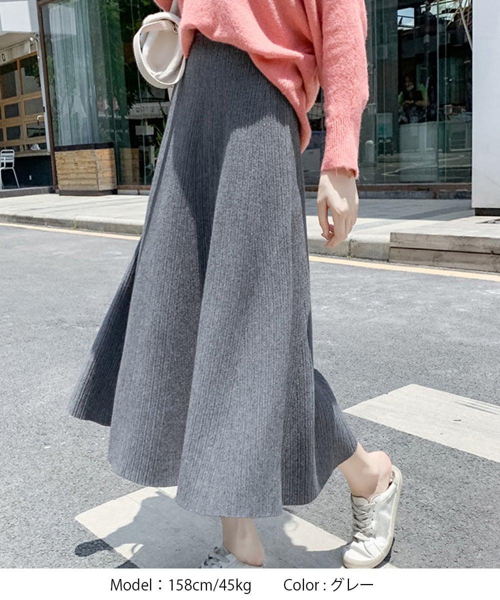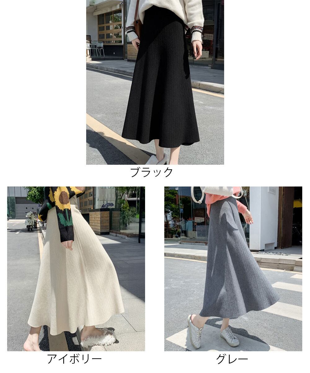 レディース Aラインスカート リブスカート ウエストゴム ハイウエスト ボトムス 体型カバー 大人可愛い 韓国風