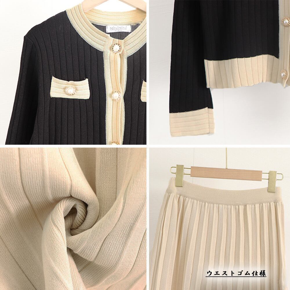 ニットアンサンブル レトロバイカラー ニットカーディガン ハイウエスト ニットプリーツスカート きれいめツーピースセット