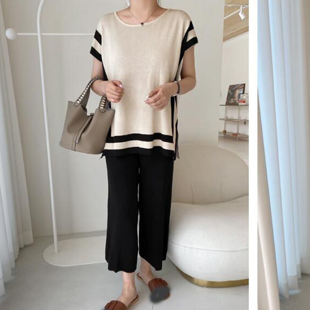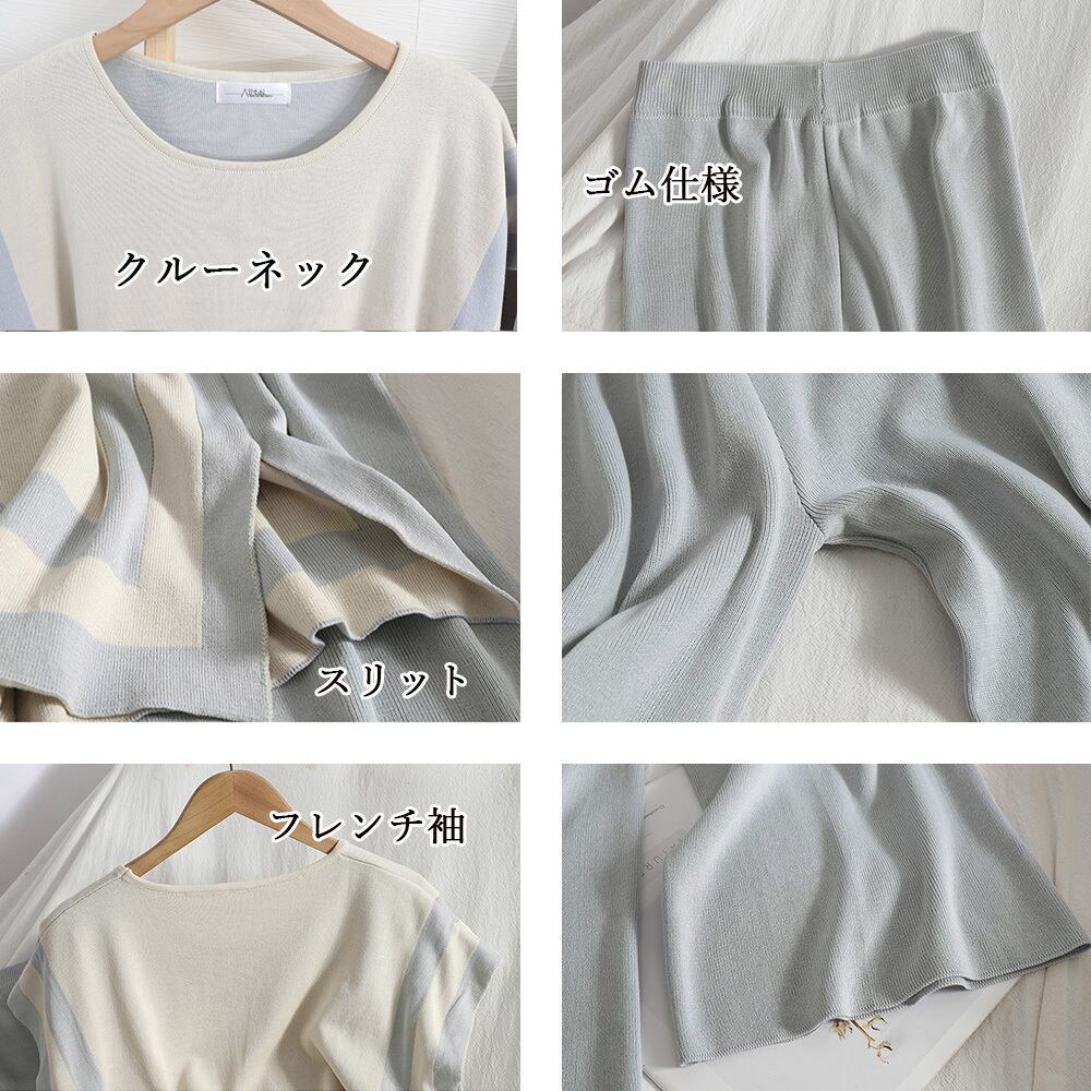 サマーニット スリットトップス ワイドパンツ 2点セット ゆったり オフィスカジュアル フレンチ袖ニット きれいめ 薄手